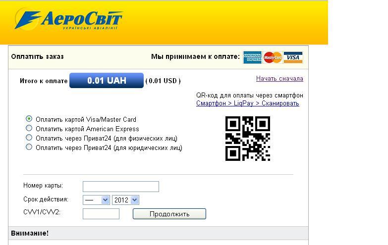 Возможность быстро оплатить перелёт с помощью мобильного телефона доступна для всех рейсов "АэроСвита" - как внутренних, так и международных. Чтобы пользоваться сервисом оплаты по QR-коду, нужно установить на смартфон бесплатное платежное приложение Privat24 (для клиентов ПриватБанка) или Liqpay, который дает возможность оплачивать билеты и другие покупки с любых платежных карт любого банка мира.