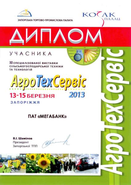 "МЕГАБАНК" нагороджений дипломом виставки "Агротехсервіс - 2013"