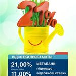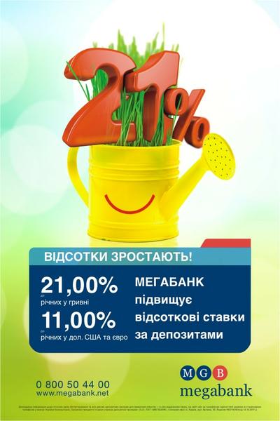 "МЕГАБАНК" повысил проценты по всем видам депозитов. В частности, при размещении средств на депозиты, которые сегодня действуют в банке, проценты в гривне теперь составляют до 21% годовых, евро и долларах – до 11%.