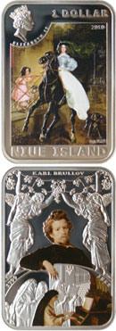 На аверсе монеты представлена картина Карла Брюллова «Всадница», изображение прекрасной дамы на коне с маленькой девочкой и двумя собаками, портрет Ее Величества Королевы Елизаветы II, надпись: NIUE ISLAND (эмитент), 1 DOLLAR (номинал).