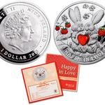 На реверсе монеты представлено изображение пары сидящих сказочных кроликов, держащих красное сердце (стеклянная вставка). На фоне – изображения растений и плодов земляники. Внизу – надпись: HAPPY IN LOVE (счастливы в любви).