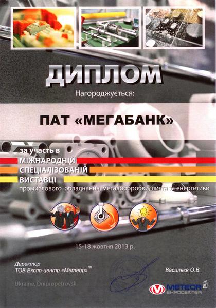 Днепропетровское отделение "МЕГАБАНКА" получило диплом за участие в выставке "Енергопром 2013"
