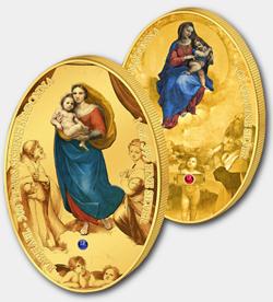 В отделениях Райффайзен Банка Аваль, являющихся участниками программы «Монеты мира», можно приобрести набор из двух монет отчеканенных к 500-летнему юбилею двух шедевров мирового искусства — Сикстинской Мадонны и Мадонны ди Фолиньо.Монетный двор Майера (Германия) выпустил серебряные монеты с позолотой, на которых воспроизведены цветные изображения этих картин великого мастера эпохи Возрождения Рафаэля Санти.