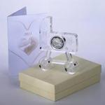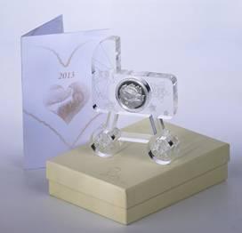 Монету упаковано в рамку - колиску з вітальною листівкою, де зазначається ім'я, дата народження дитини та побажання її родині.