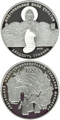 На аверсе монеты вверху размещены полукругом надпись «НАЦІОНАЛЬНИЙ БАНК УКРАЇНИ», справа отчеканен малый Государственный Герб Украины и стилизованная композиция в центре которой – Антоний Печерский на фоне скал, напоминающих крылья. Внизу – древнерусский орнамент и надписи полукругом ДВАДЦЯТЬ ГРИВЕНЬ, справа – год чеканки монеты «2013».