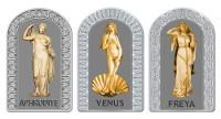 На реверсах монет указаны также имена богинь в англоязычной транскрипции (Afrodite, Venus, Freyja). На аверсах изображен Пантеон («храм всех богов» в Риме), размещена надпись PRINCIPAT D'Andorra и номинал монеты — 1 динер. Монеты изготовлены из серебра 999 пробы с позолотою. Качество чеканки — пруф. Вес каждой монеты — 31,10 г. Год выпуска — 2012.
