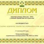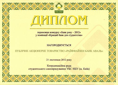 Райффайзен Банк Аваль назван победителем в номинации «Лучший банк студенчества» IV Всеукраинского конкурса «Банк года — 2012» по версии журнала «Банкиръ».Эта специальная номинация была учреждена Университетом банковского дела Национального банка Украины в 2009 году.