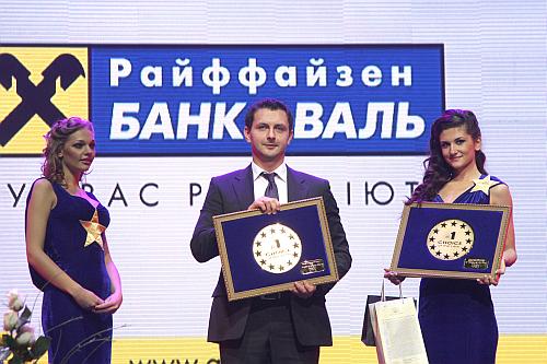 На фото: Александр Крышталь, начальник управления маркетинга и развития отношений с клиентами Райффайзен Банка Аваль, получает награды Международного фестиваля-конкурса «Выбор года 2012».