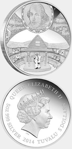 К празднованию 450-й годовщины со дня рождения известнейшего англоязычного писателя Монетный двор г.Перт (Австралия) выпустил серебряную монету «450-летие Уильяма Шекспира», которую уже можно приобрести в отделениях Райффайзен Банка Аваль.Аверс монеты украшает портрет Ее Величества Королевы Елизаветы II, помещенный в центре. По кругу — надписи: "QUEEN ELIZABETH II", 5 oz SILVER", "2014", "TUVALU" и "5 DOLLARS".