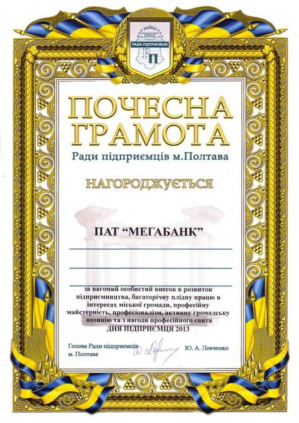 Совет предпринимателей Полтавы по случаю празднования профессионального праздника – Дня предпринимателя (в Украине отмечается в первое воскресенье сентября уже 15 лет подряд) вручил "МЕГАБАНКУ" награду, которая присвоена: "за весомый личный вклад в развитие предпринимательства и многолетний плодотворный труд в интересах городской громады, профессиональное мастерство, профессионализм, активную общественную позицию".Награду получила директор Полтавского центрального регионального отделения "МЕГАБАНКА" Янина Данько. По ее словам, Полтавское ЦРО уже давно и плодотворно сотрудничает с представителями областного совета предпринимателей. В результате этого сотрудничества, по состоянию на 1 сентября 2013 года, в филиале обслуживается около 900 корпоративных клиентов. Их кредитный портфель на сегодня составляет 215, 7 млн.грн. Депозитный – 14,3 млн.грн.