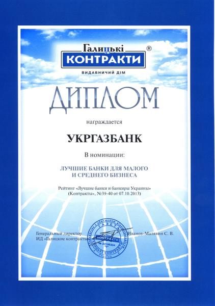 21 ноября в Киеве состоялась торжественная церемония награждения победителей рейтинга «Лучшие банки и банкиры Украины 2013», опубликованном в бизнес издании Контракты.Укргазбанк стал победителем в номинации «Лучшие банки для малого и среднего бизнеса». Диплом издательского дома «Галицькі контракти» получила заместитель Председателя Правления Укргазбанка Елена Дмитриева.