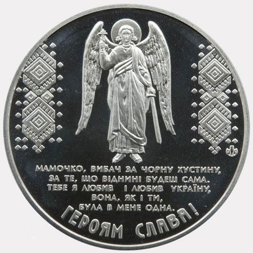 На аверсе медали изображен архангел Михаил в окружении орнамента, под ним надписи: "Мамочко, вибач за чорну хустину, за те, що віднині будеш сама. Тебе я любив і любив Україну, вона, як і ти, була в мене одна" и "Героям слава!". Справа под орнаментом логотип Монетного двора Национального банка Украины.