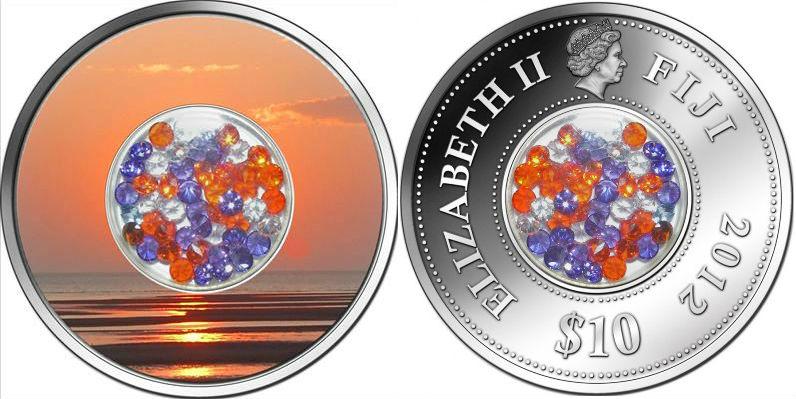 В частности, на реверсе монеты в высоком качестве нанесена фотография моря на закате. А ключевым элементом композиции является размещенная посередине монеты сквозная капсула с 50-ю маленькими кристаллами циркония в цветовых оттенках фотографии.