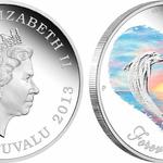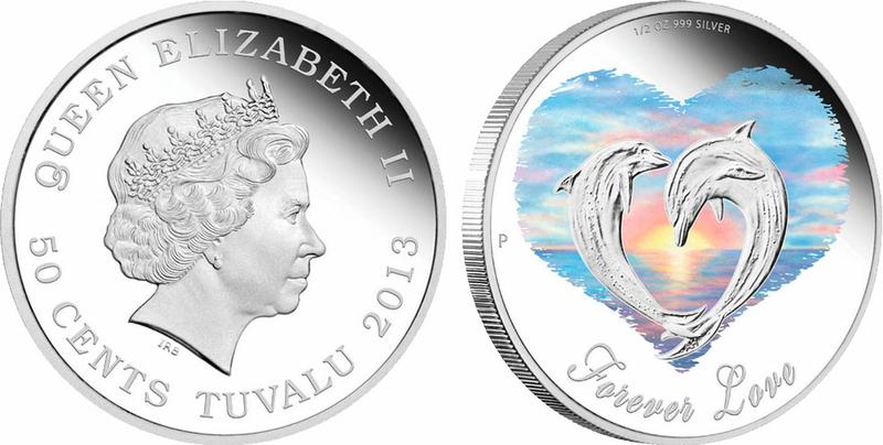 На реверсе серебряной монеты изображена цветная картинка в форме сердца: на фоне безбрежного океана на закате отчеканены два дельфина. Океан символизирует глубину чувств, а дельфины – любовь и преданность. Рядом с картинкой можно увидеть надпись «Любовь навсегда».