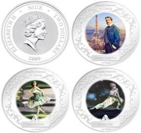 Цей незвичайний комплект з трьох кольорових монет присвячений «Російським сезонам» - знаменитій серії виступів російських артистів опери і балету, що проводилися в Парижі на початку XX ст.