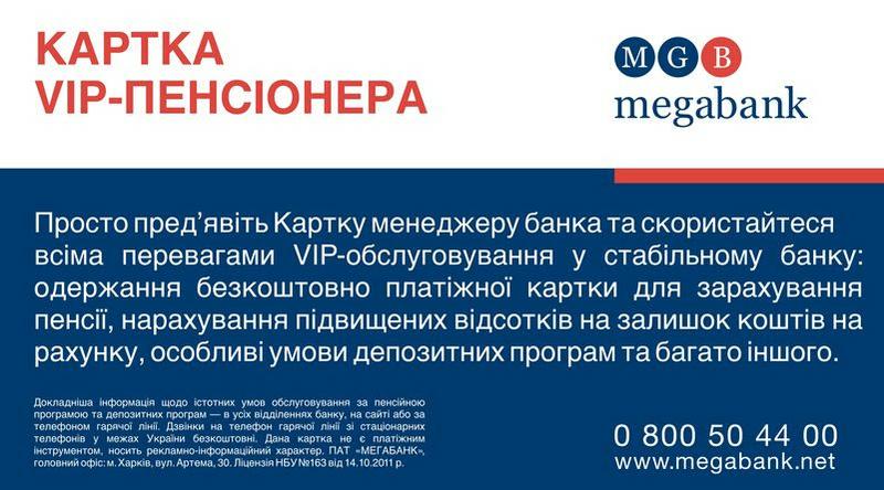 В "МЕГАБАНКЕ" стартовала акция для пенсионеров "VIP-обслуживание", которая продлится до 31 августа 2014 г. Участниками акции могут стать пенсионеры, которые решили открыть текущие счета в банке для получения пенсии. Привилегии данной акции следующие:- при размещении средств на любой вид вклада (кроме вклада "До востребования") пенсионер имеет право получить бонус в виде дополнительного 1% годовых к действующим ставкам на момент обращения клиента в "МЕГАБАНК";