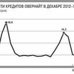 Приток средств был обеспечен гривневыми депозитами. "В течение прошлого года некоторые люди размещали на депозитах валюту и получали по 7-10% годовых, а другие несли гривну и зарабатывали по 20-25%. В результате стало ясно, что выгоднее хранить сбережения в национальной валюте",— говорит главный финансовый аналитик агентства "Эксперт-Рейтинг" Виталий Шапран. В 2012 году население положило на счета банков в национальной валюте 26 млрд грн, из которых 6,4 млрд грн поступило в декабре. С учетом прироста валютных депозитов и наращивания остатков на счетах предприятий в банки в конце прошлого года поступило в целом 31 млрд грн. В то же время в связи с окончанием года они не спешили с выдачей новых займов, поэтому объем кредитного портфеля сократился на 5,8 млрд грн. За счет возникших излишков ставки на межбанковском рынке начали снижаться и 15 января достигли 4,4% (см. график).